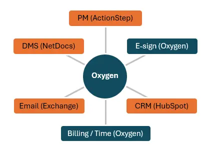 Oxygen gives you the flexibility to connect and orchestrate your existing legal tools or switch them as needed. It sits at the center of your firm as a data hub, integrating with the platforms you already rely on.