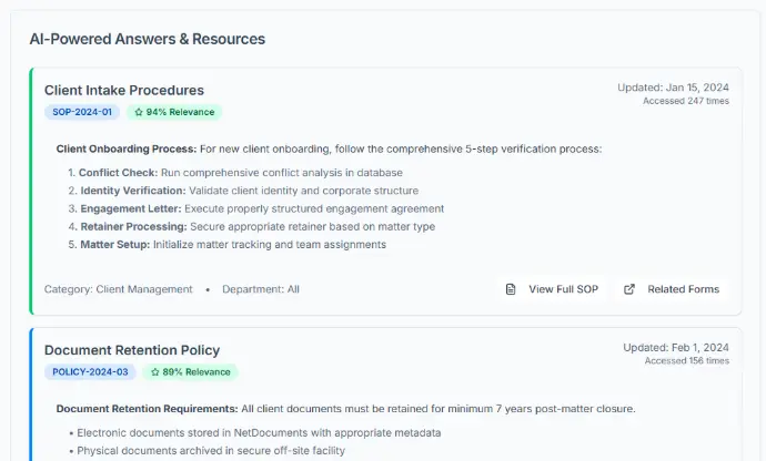 Empower team members to ask questions like “How do we handle a custody retainer?” or “What’s our standard filing order?” — and get answers from firm-defined SOPs.