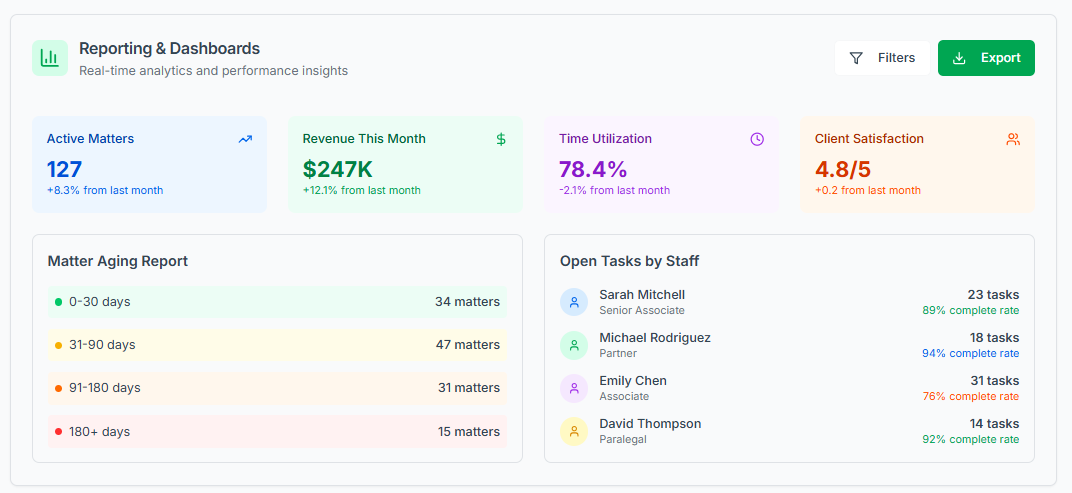 Flag inactive matters, overdue tasks, or workload bottlenecks.