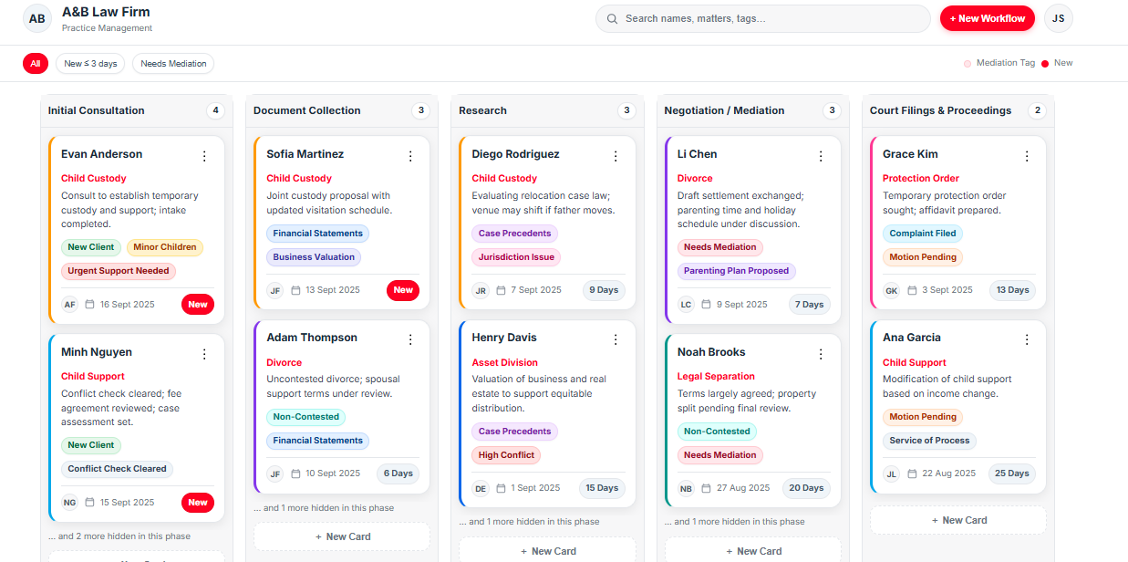Checklists, folders, roles, and due dates spin up the moment a matter opens.